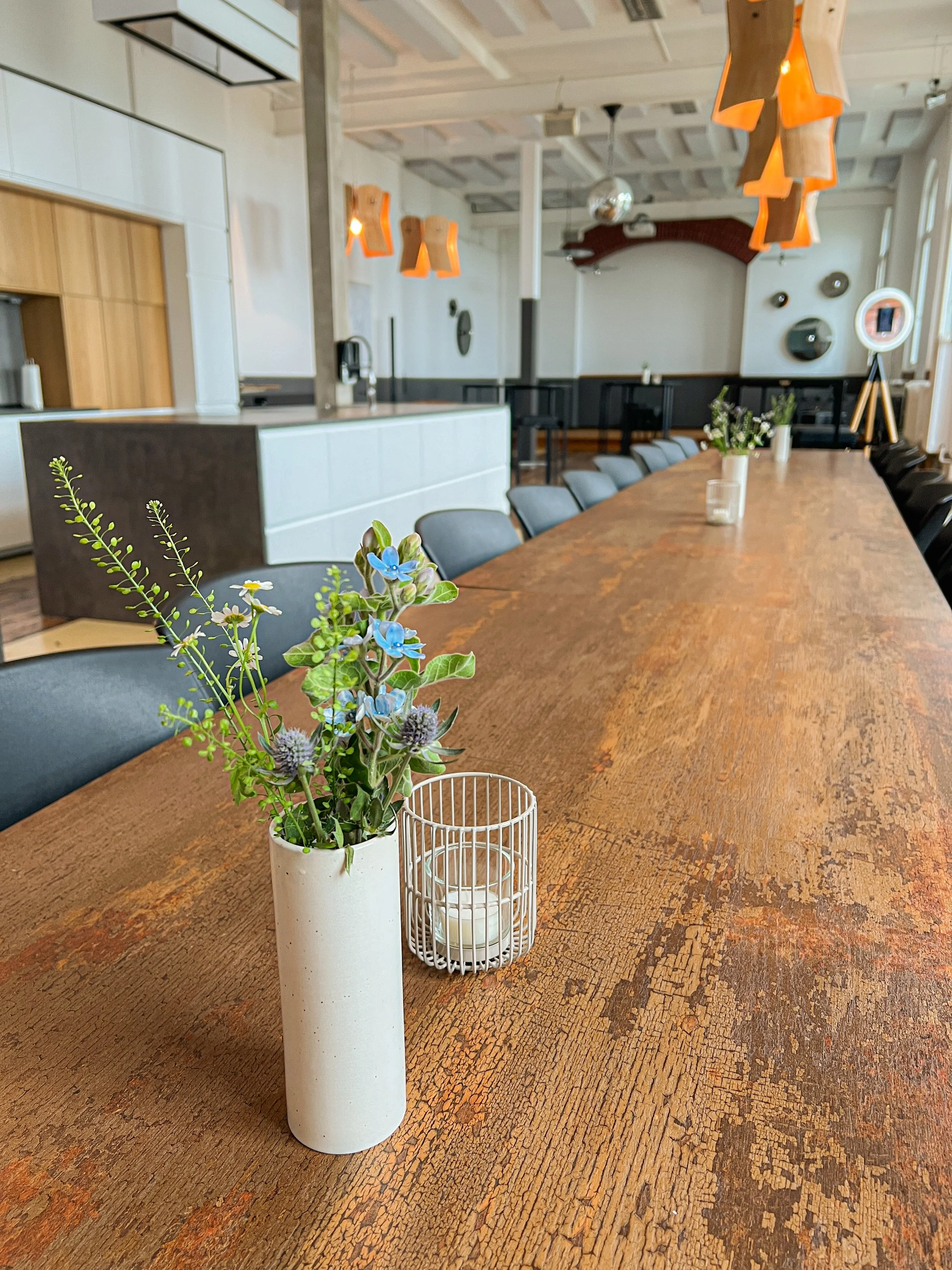 Auch im Interieur trefft ihr auf Historie und Moderne: Ein Boden aus alten Bahnschwellen trifft auf moderne Ausstattung, hohe weiße Wände und ein einzigartiges, eindrucksvolles Dekor. Großzügige Proportionen und viel Tageslicht schaffen Kopffreiheit und Fokus. Abends setzt warmes Licht die passende Stimmung für lebendige Küchenpartys.